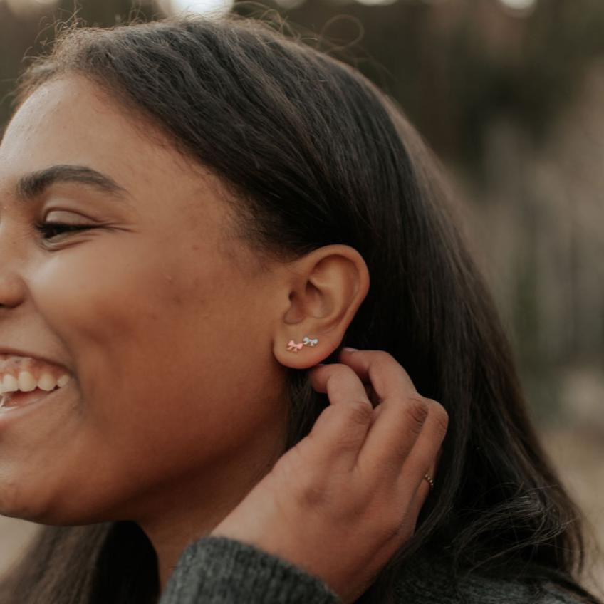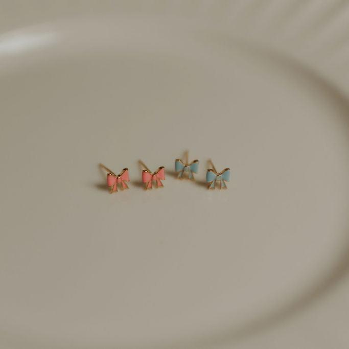 The Clara Bow Studs are the perfect, dainty earring that goes with everything! They are available in gold vermeil or sterling silver and are hypoallergenic, tarnish and wear resistant, and perfect for sensitive ears. Available in the cutest shades of baby blue or pink rose.