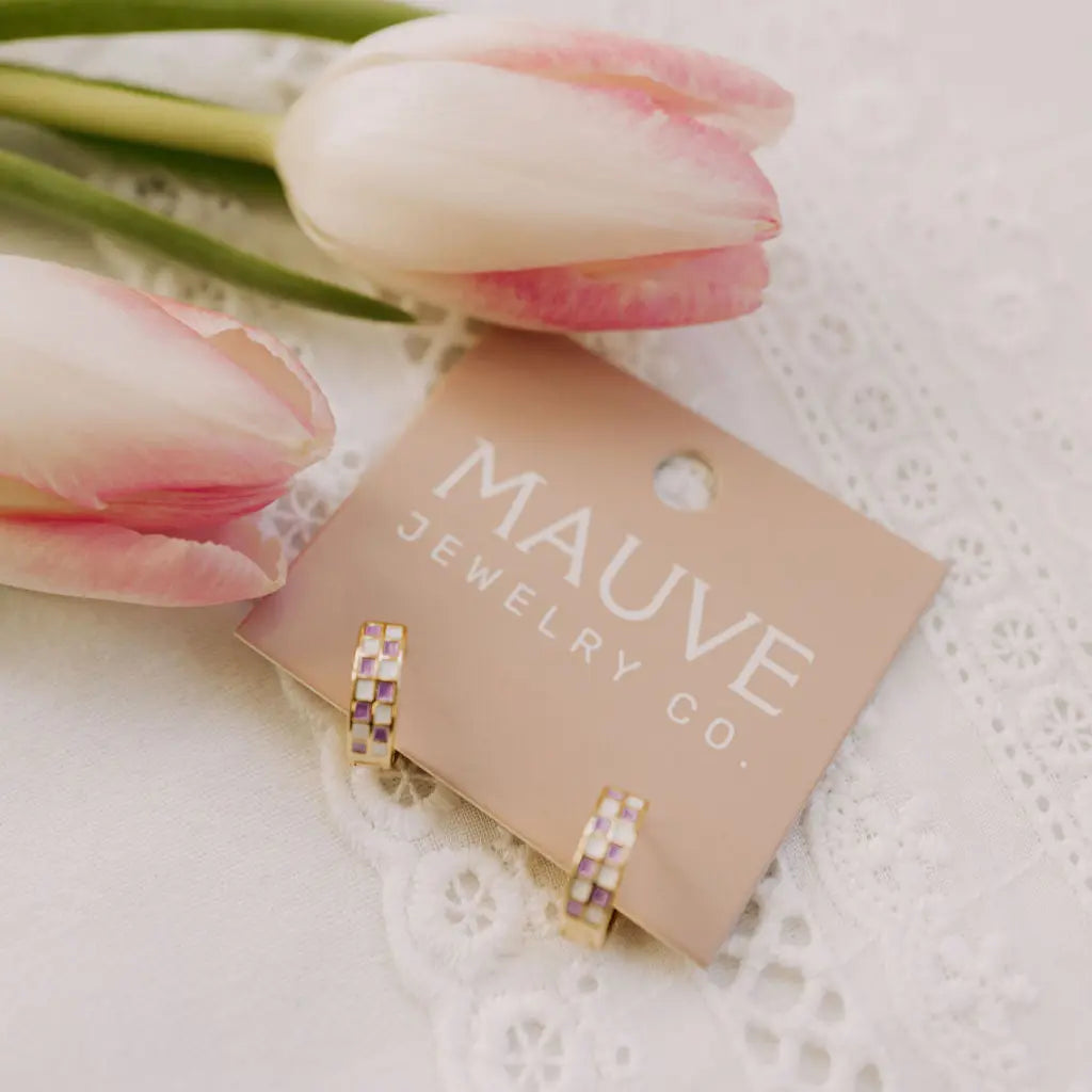 The Purple & White Checkered Hoops are made of high quality gold fill and are hypoallergenic and good for sensitive ears. They have a huggie closure style and are the cutest new jewelry trend! Outer diameter is 10mm.