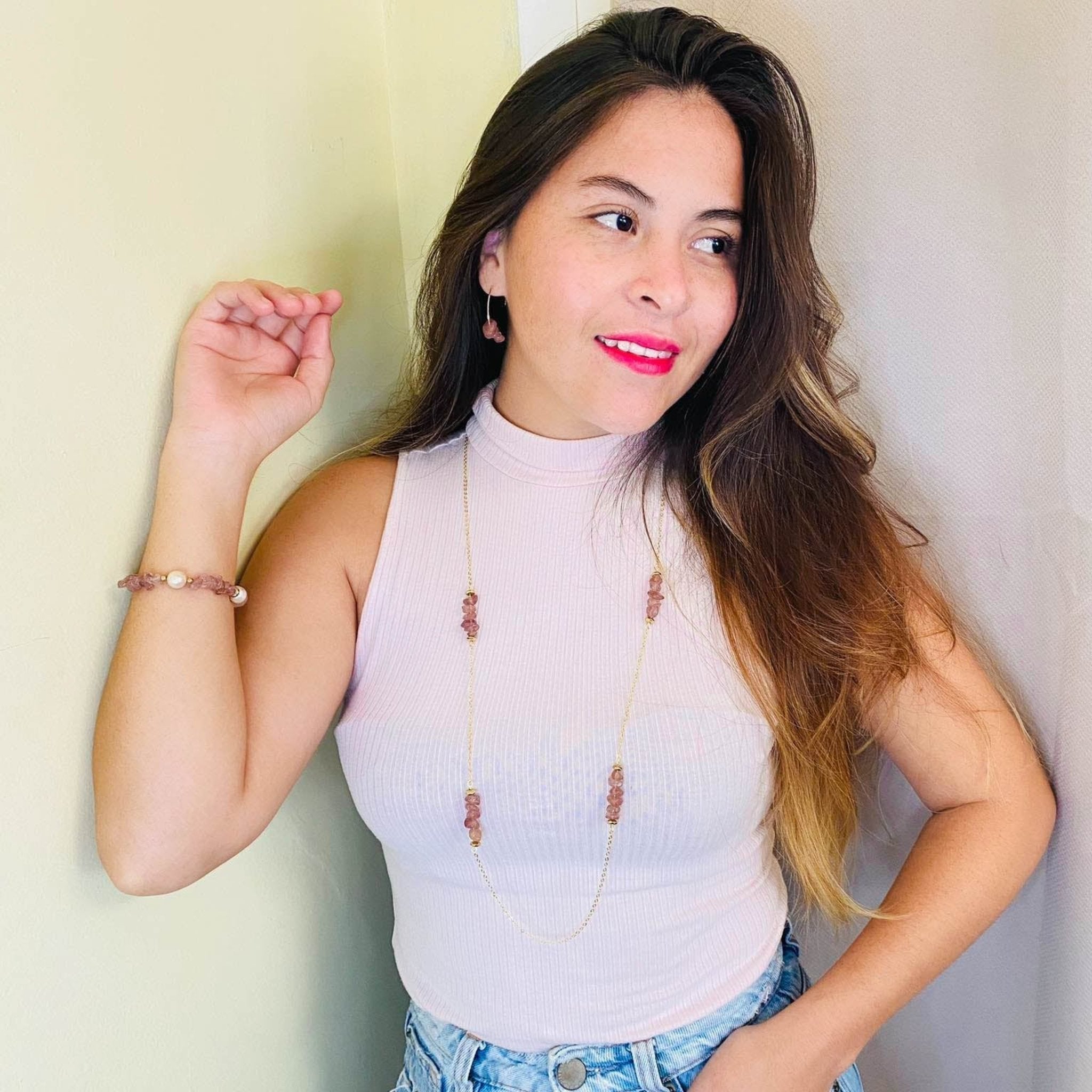 Not your ordinary hoop! These hand formed wire hoops have a cluster of strawberry quartz chips on the end. Pair it up with the new Satin necklace and the Cameo bracelet.