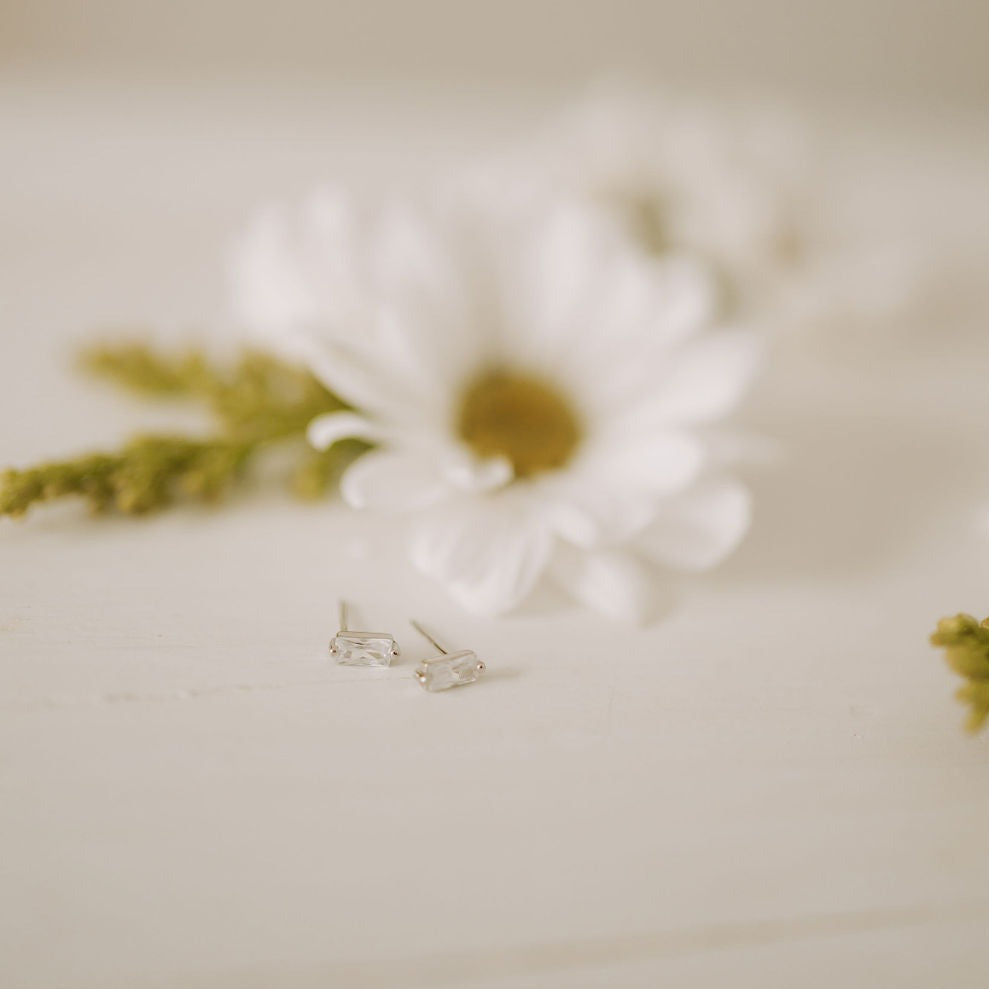 Sophie Baguette Daimond Studs come with a hypoallergenic butterfly back.