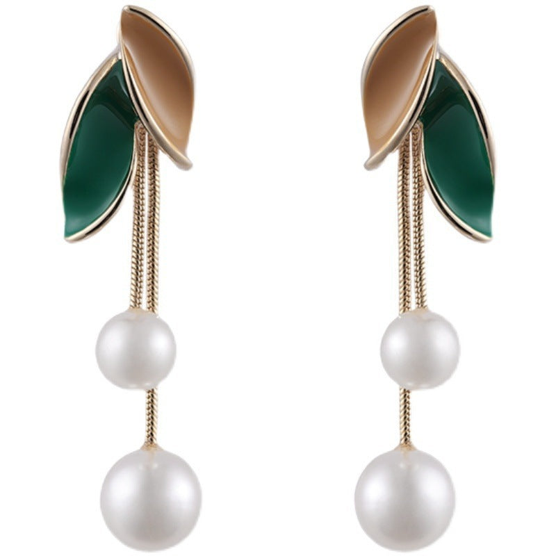 Temperament Entry Lux Pearl Leaf Tassel Earrings