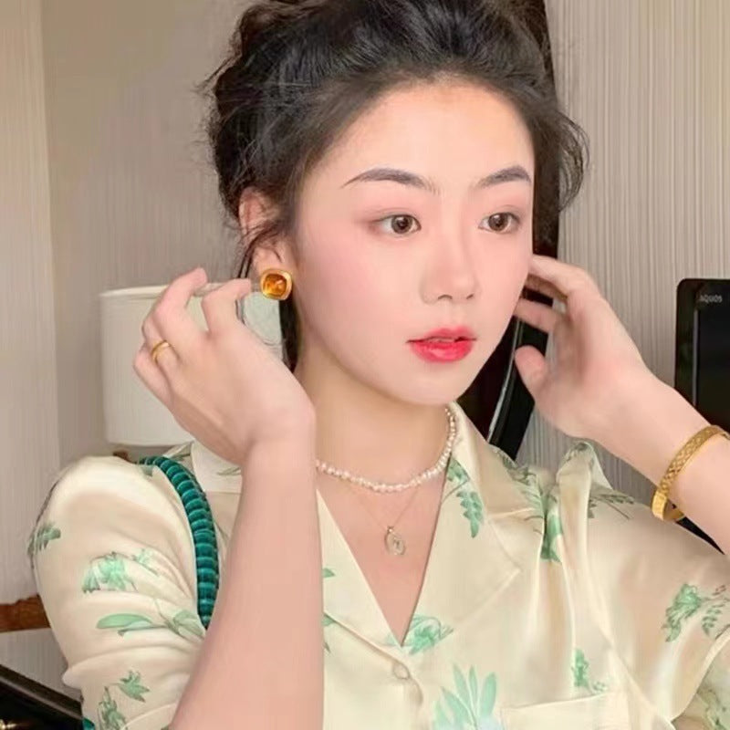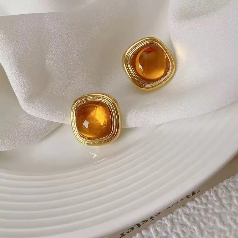 Vintage Amber Glass Crystal Geometric Square Stud Earrings