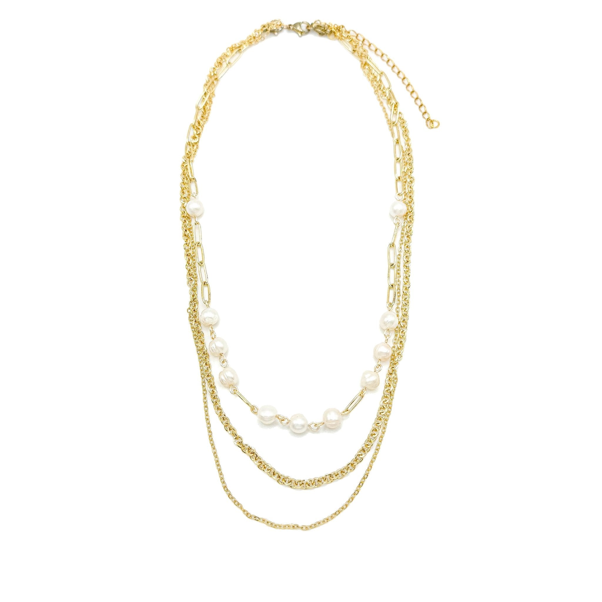 Coquette will give you endless options in your fall necklines. The short 15 inch paperclip chain is adorned with links of interspersed freshwater pearls. It also has lobster clasps at both ends so it can be removed and worn separately. The second piece features a 17 inch diamond cut larger cold plated cable chain and an 18 1/4 inch tiny elongated gold plated cable chain hanging together from a lobster clasp and featuring a 3 inch extender. Wear each piece by itself or fasten them together for a bolder statement. 3 looks in this one necklace!