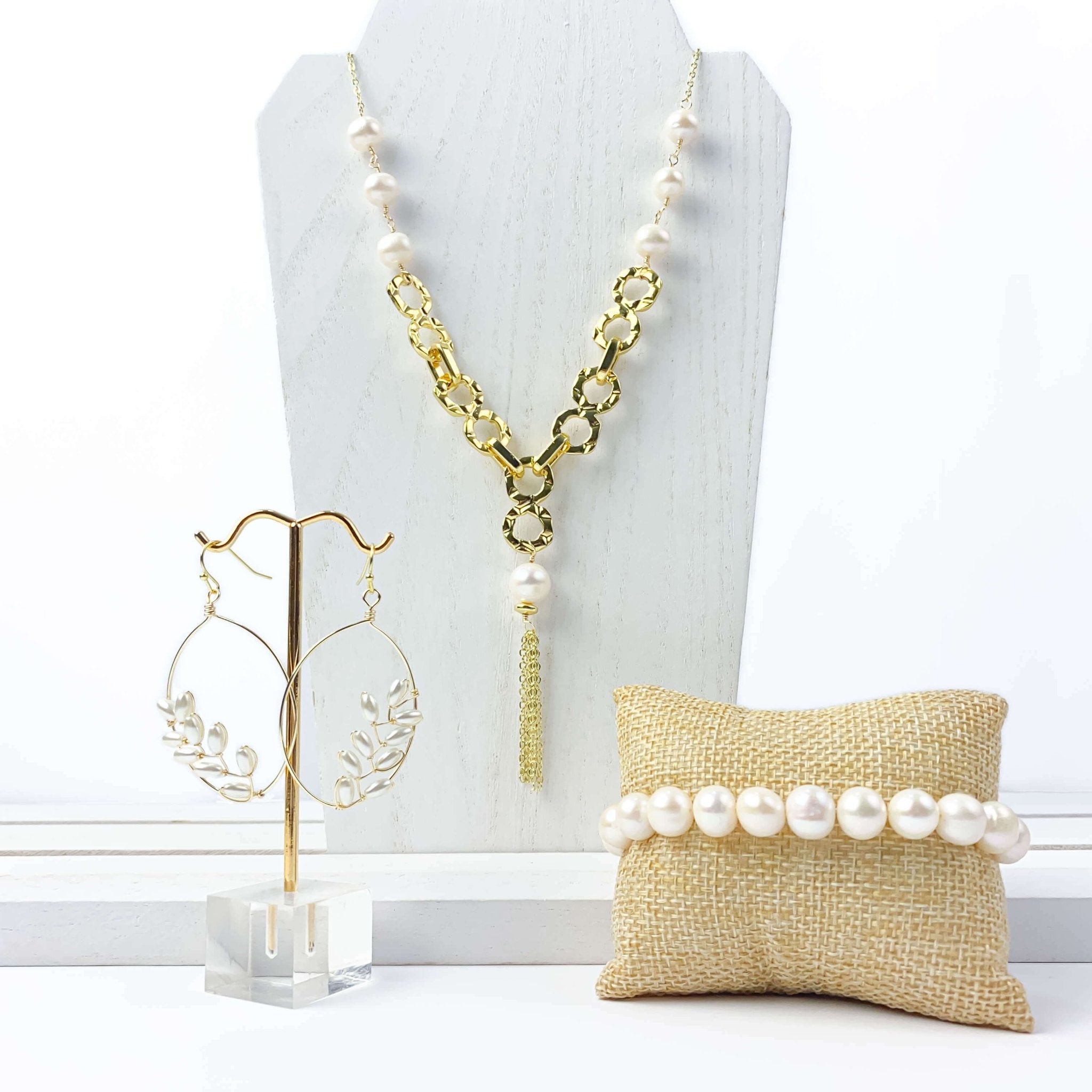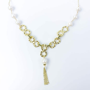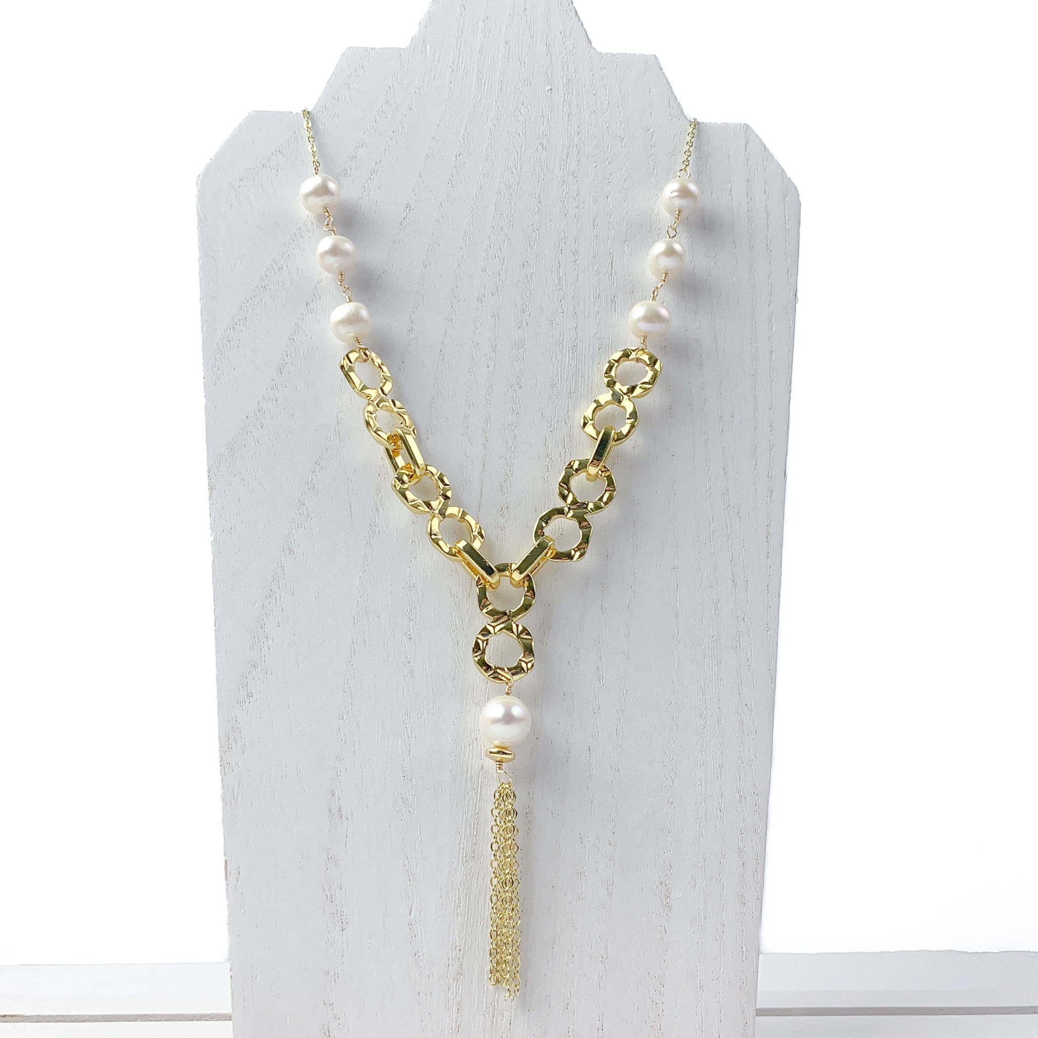 7 10mm freshwater pearls, 1 hanging from the center of the 7 gold plated hammered infinity chain loops, and 3 delicately hand-wired to the top of each side of the infinity chain. A flat gold filled spacer seats the pearl and leads to a tassel of gold plated cable chain. More cable chain suspends this work of art in a 27 inch total length necklace. Lobster clasp closure.