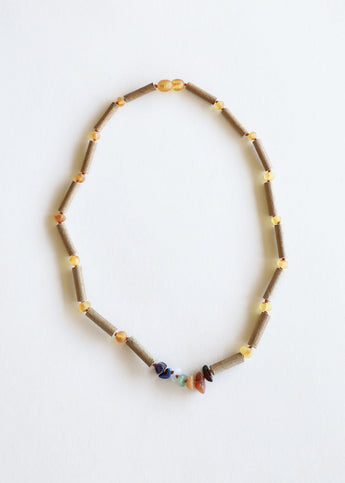 This beautiful necklace is handmade with all natural hazelwood and raw chakra crystals. The way it works is the hazelwood actually absorbs the extra acid and while it does, the wood gradually turns a darker brown color. In order for the body to be at it’s best healing level, it should be slightly more alkaline. When your body is higher in acidic pH, you are susceptible to more illnesses and pains. By helping it be more alkaline, it is better able to filter out toxins and help the body combat whatever may come its way....