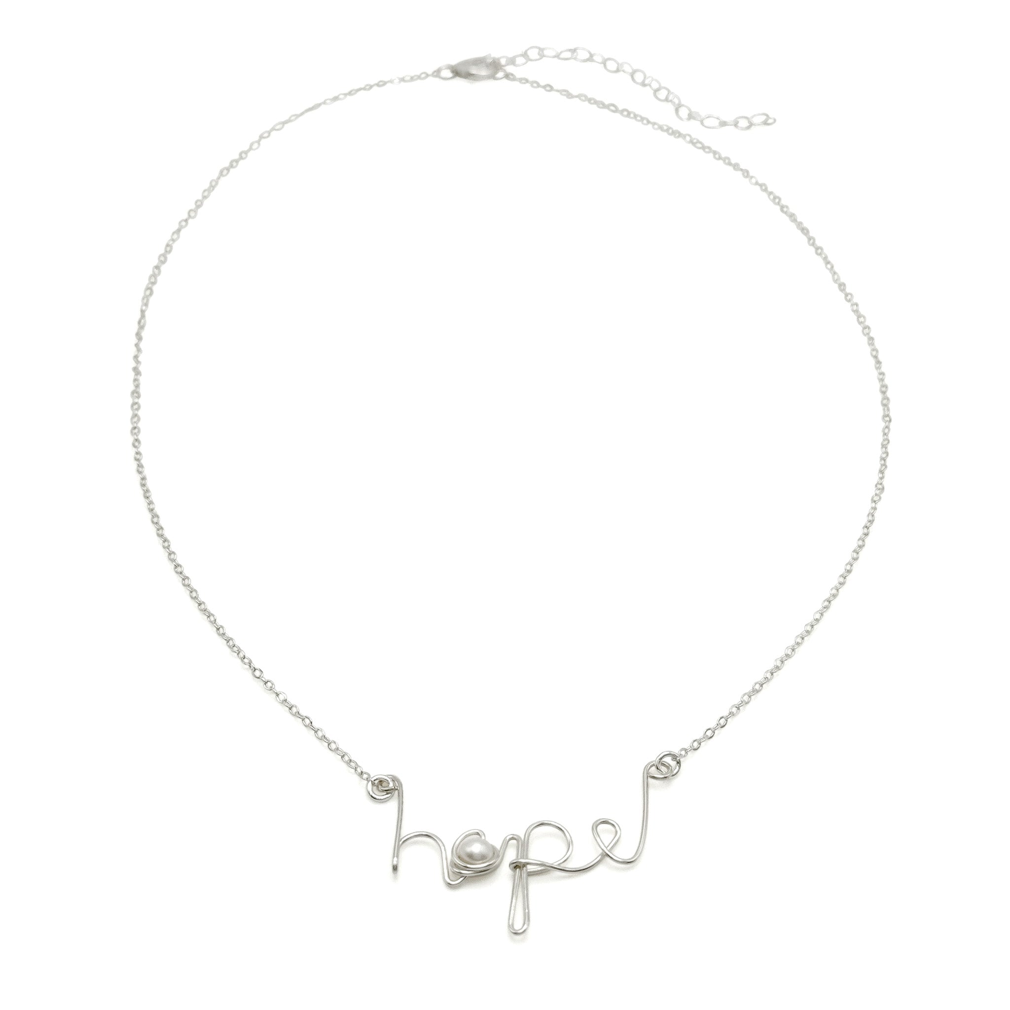 A 15 1/4" sterling silver cable chain connects to 2 small sterling silver lobster clasps with a sterling silver wire and iridescent bead embellishment. The lobster clasps suspend a sterling silver wire fashioned to say Hope with a freshwater pearl as the ‘o’.