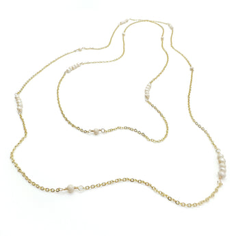 Creamy freshwater pearls alternate in stations of 1 and 5 on this gold 46 inch infinity chain.