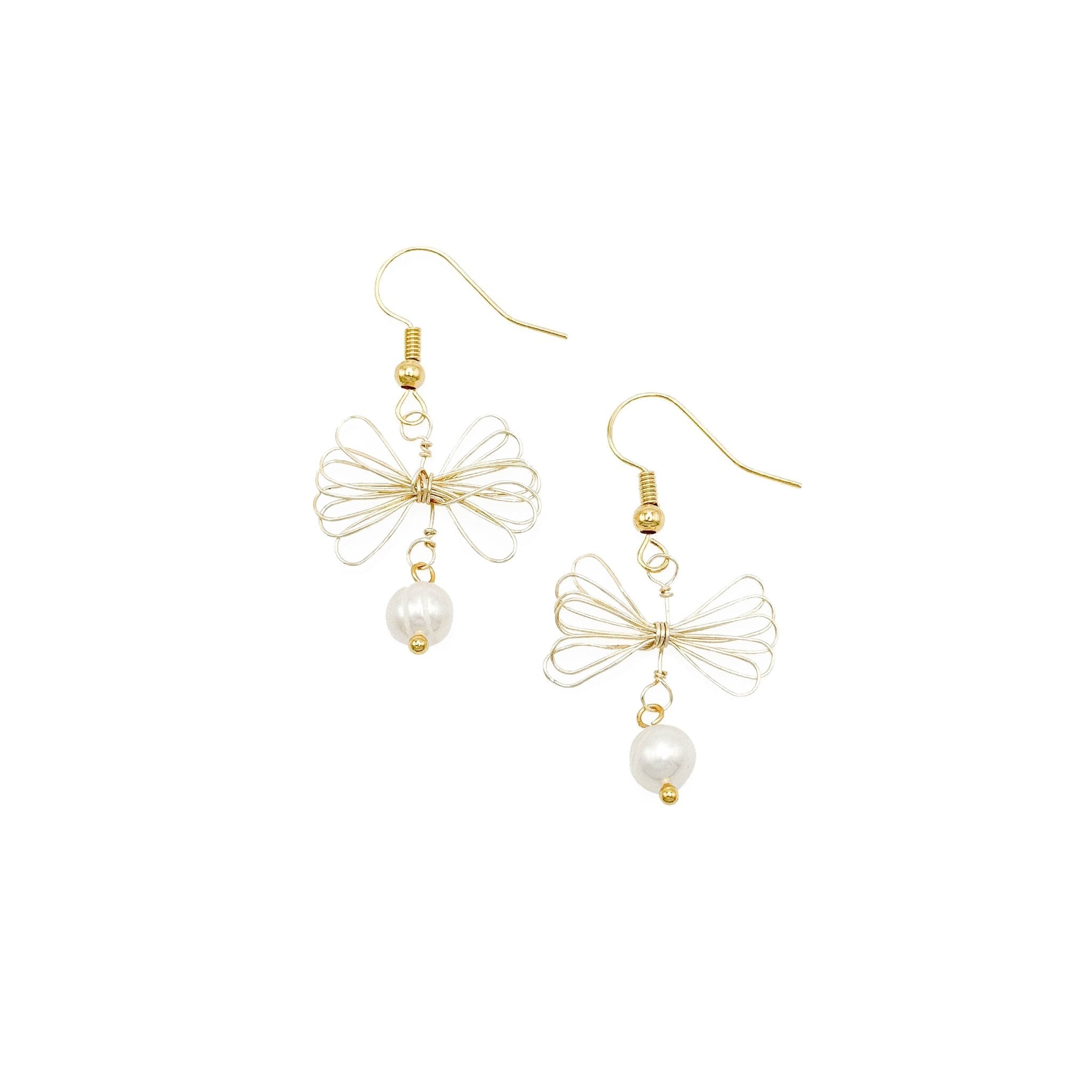 Following the ribbon and bow trend popping up everywhere for fall, our Coquette earrings feature a gold plated hand wired bow fanned out above a freshwater pearl drop on a hypoallergenic gold plated fishhook. 1 5/8 inches total length.