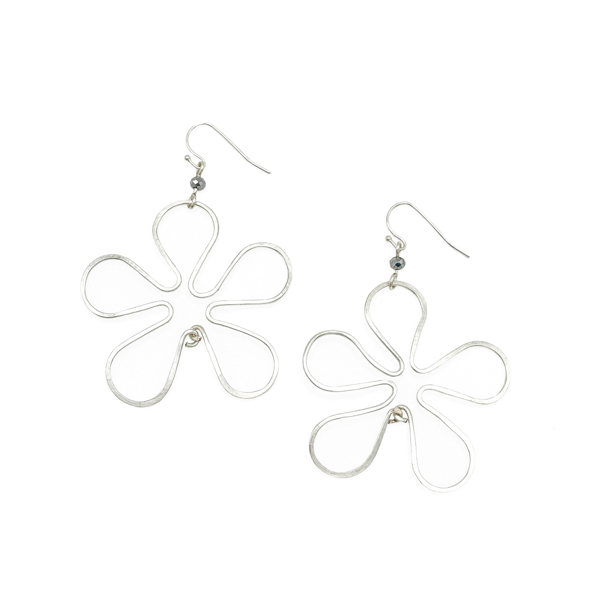 Whimsical hammered silver-plated flowers that you won't even know you're wearing! (well, until the compliments start). They dangle from a wire holding a silver faceted crystal fastened to a hypoallergenic silver plated fishhook.