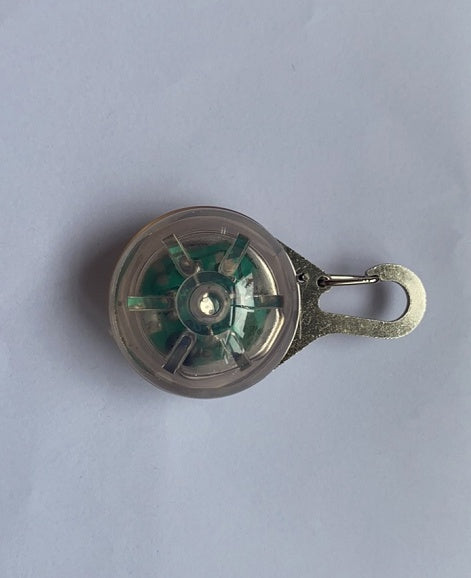 The LED collar light features a durable stainless steel carabiner clip and easily replaceable batteries