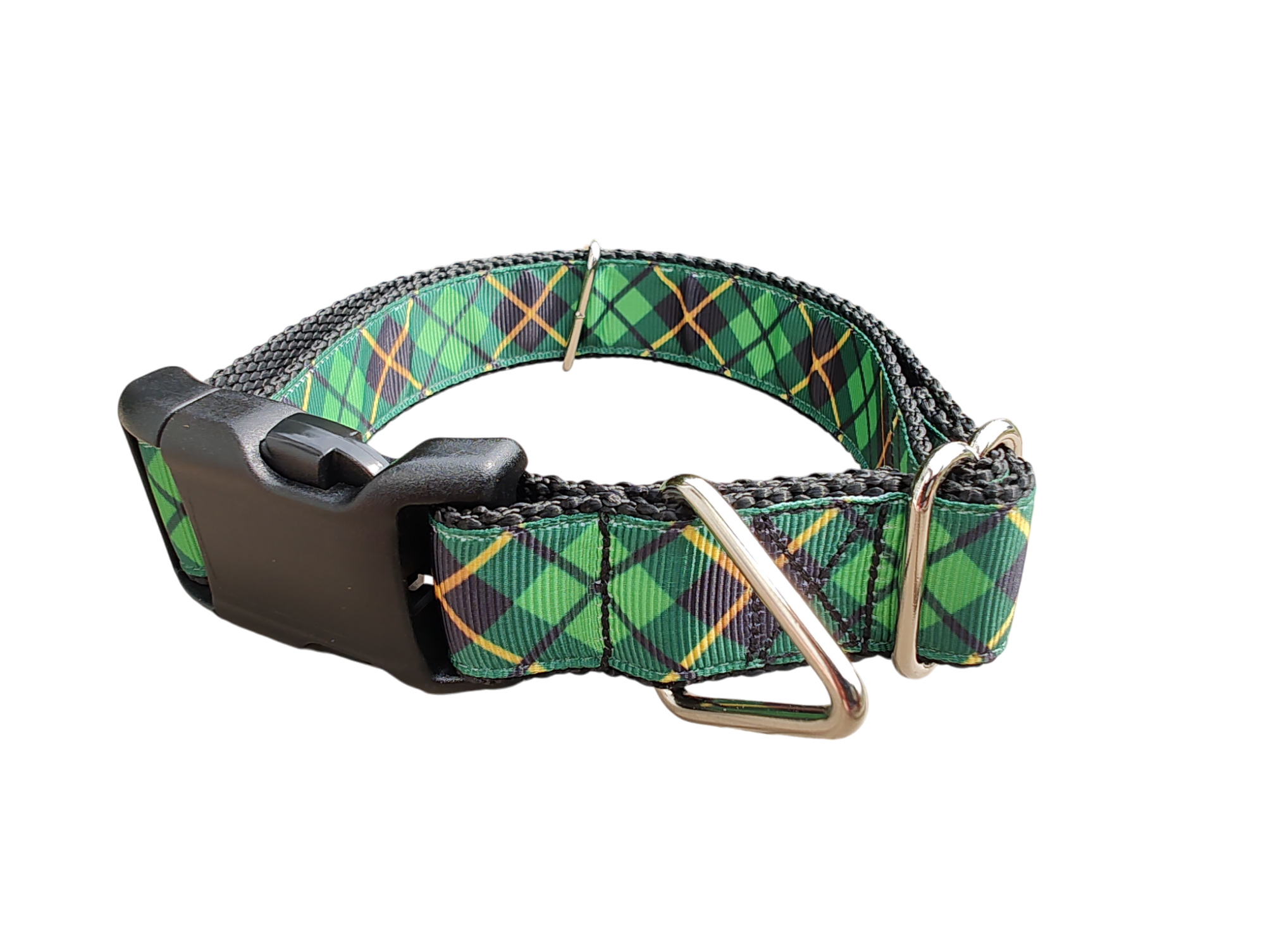 Green and Gold Plaid dog collar on nylon webbing