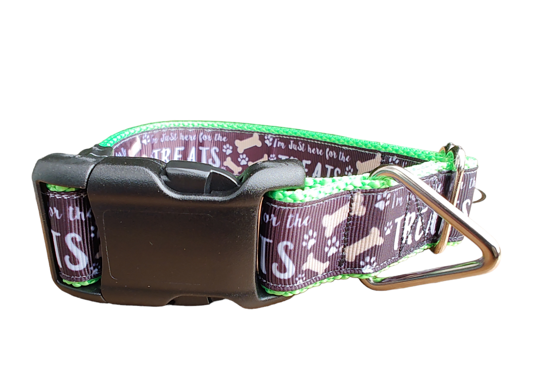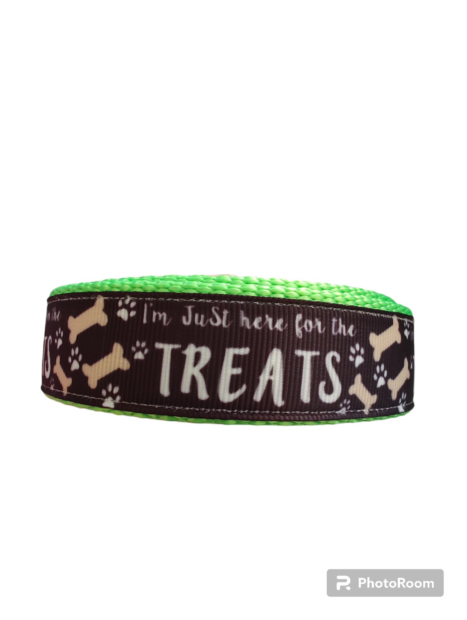Here for the treats dog collar on neon green nylon webbing