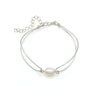 A lustrous 10mm freshwater rice pearl suspended on a silver plated wire looped between matching arches of silver plated wire form this graceful bracelet.  The large 12mm lobster clasp and 1 1/2 inch extender make it both versatile and easy to fasten.  Fits 6 1/2 - 8 inches.