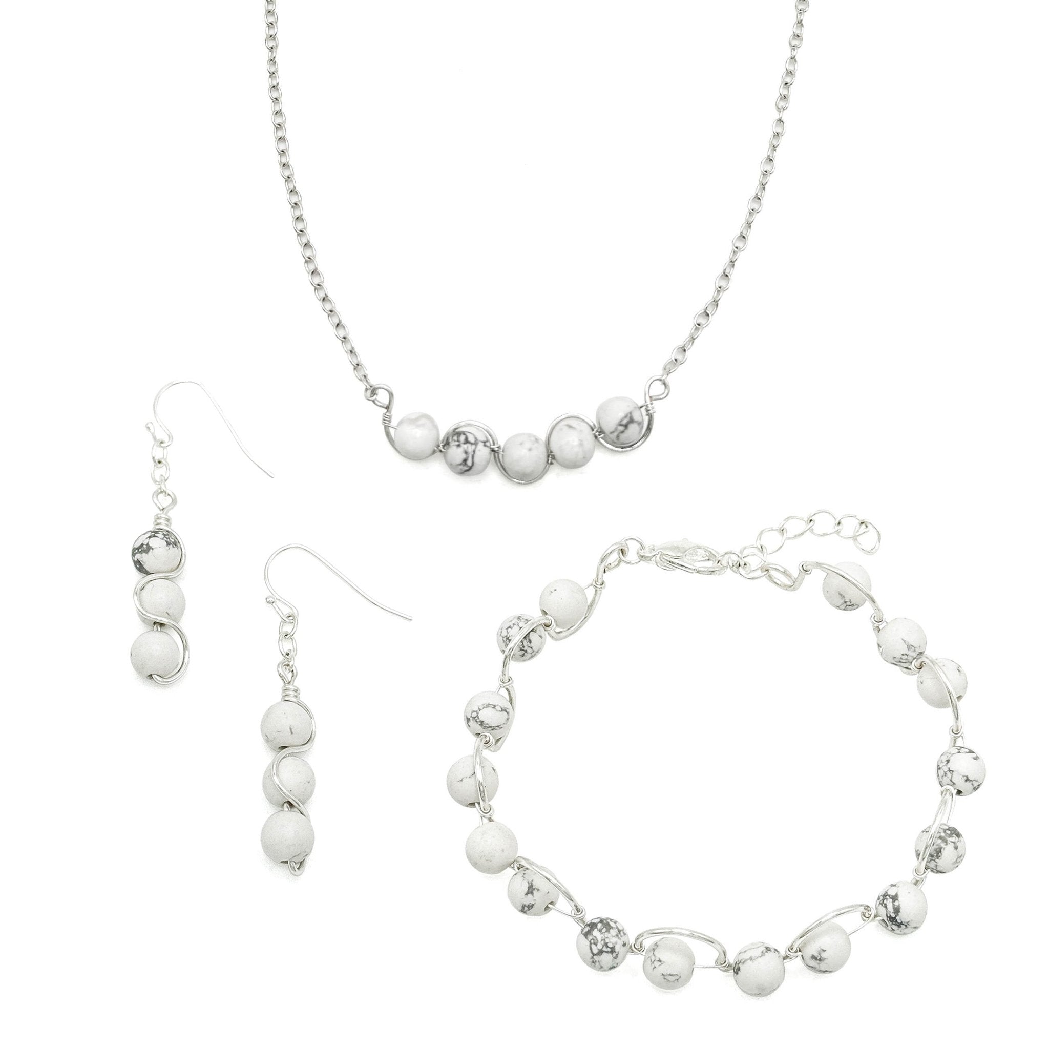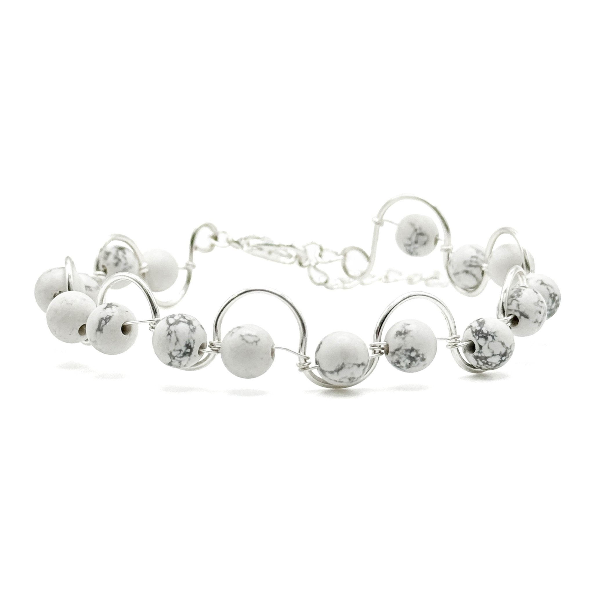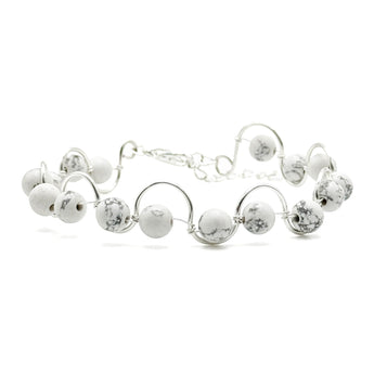A swooping silver wire zigzags around your wrist and is adorned with a white howlite stone sliding between each swoop. The lobster clasp and 1 1/2 inch extender safety chain will keep your bracelet securely fitting your 6 1/2 to 8 inch wrist.