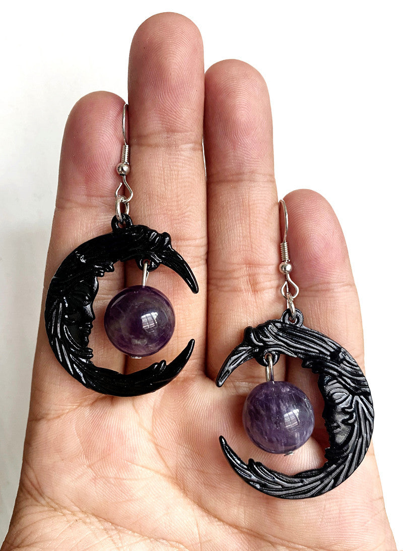 Gothic Face Black Crescent Amethyst Pendant Necklace Earrings