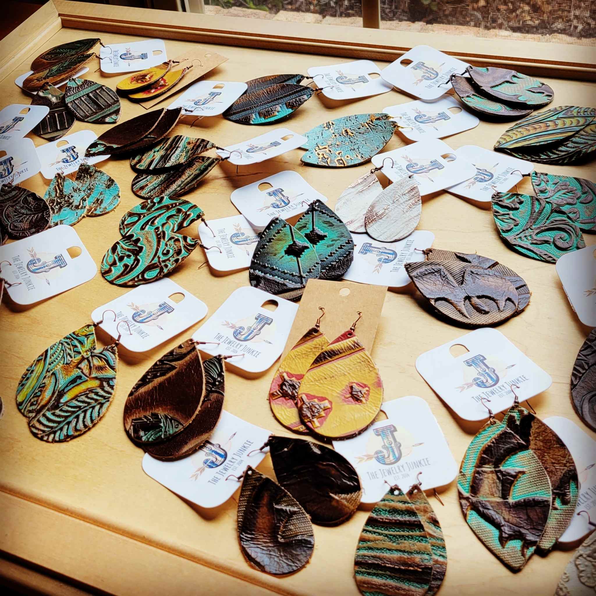 - These earrings will come to you in assorted hides, based on what we are currentlycutting, and sizes (see example photos below)