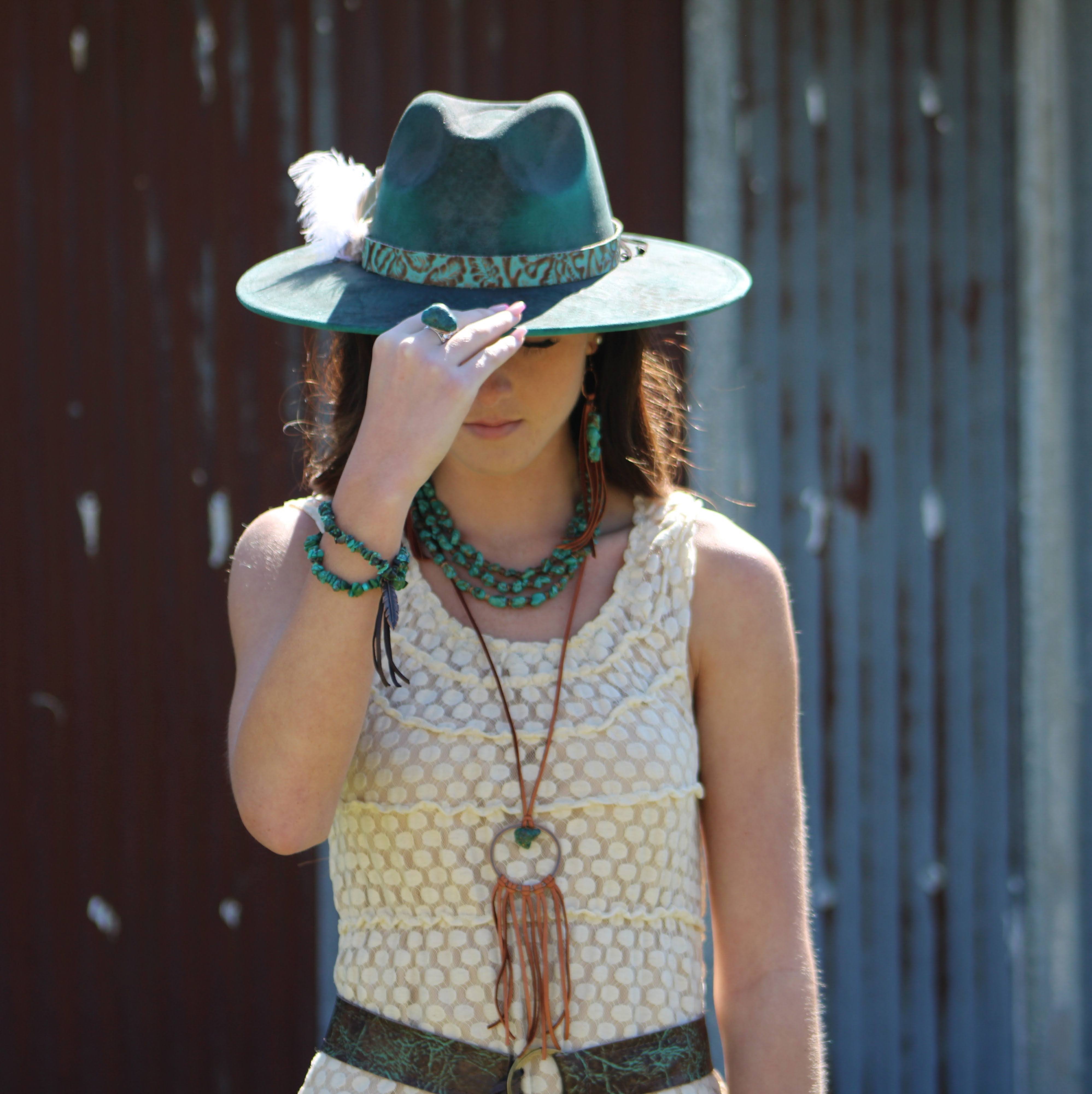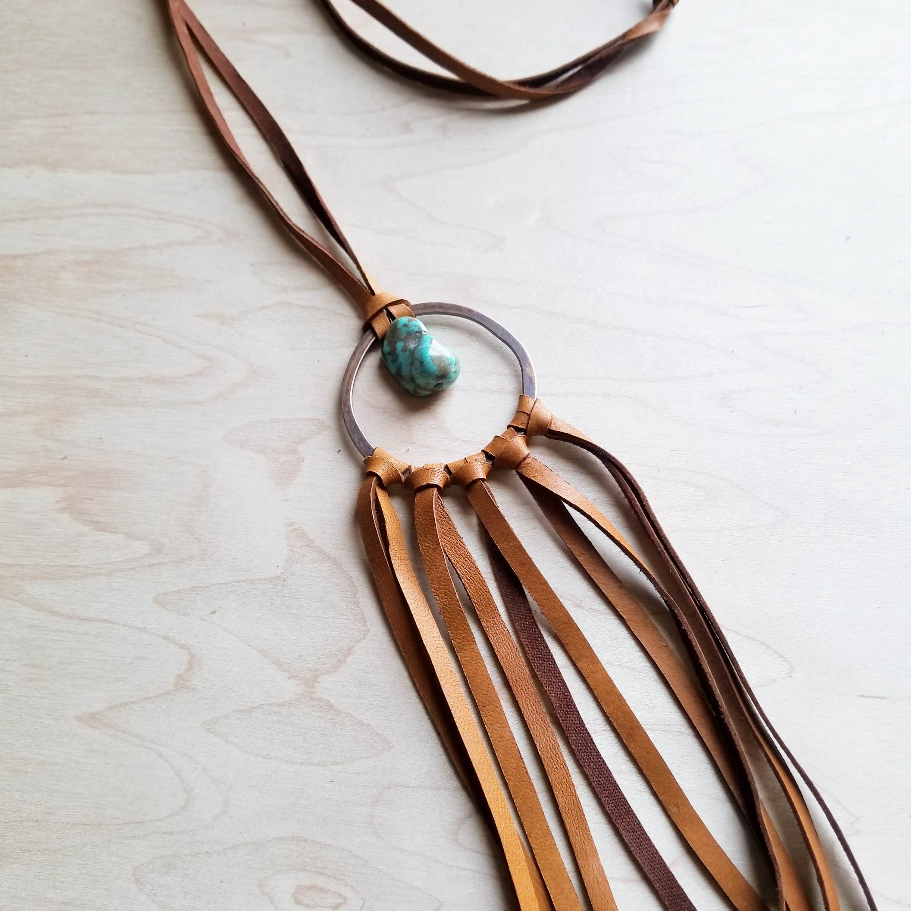 Expertly handcrafted by skilled artisans, this Tan Leather Dream Catcher Necklace with Genuine Natural Turquoise Chunk is the perfect addition to any boho chic look. The intricate design and use of high-quality leather and turquoise create a unique and eye-catching piece. Elevate your style with this stunning and one-of-a-kind necklace.