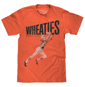 To help fellow fans of this wholesome breakfast cereal show their love - we featured a graphic of the classic Wheaties cereal logo and football player graphic on this tee. To complete the vintage look and feel - we've printed it on the highest quality poly-cotton orange tee shirt around.