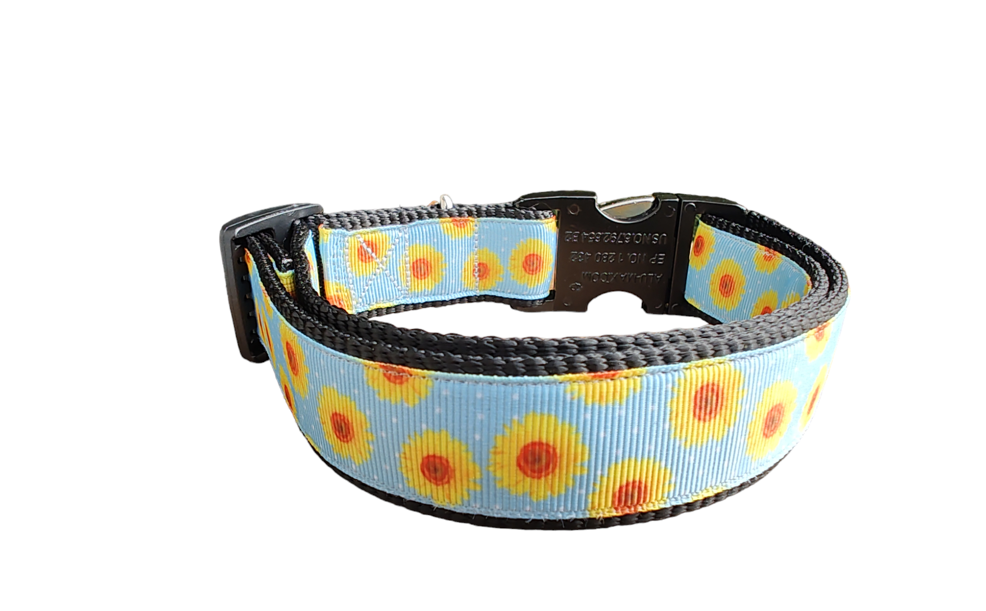 Yellow Flowers dog collar on black nylon webbing