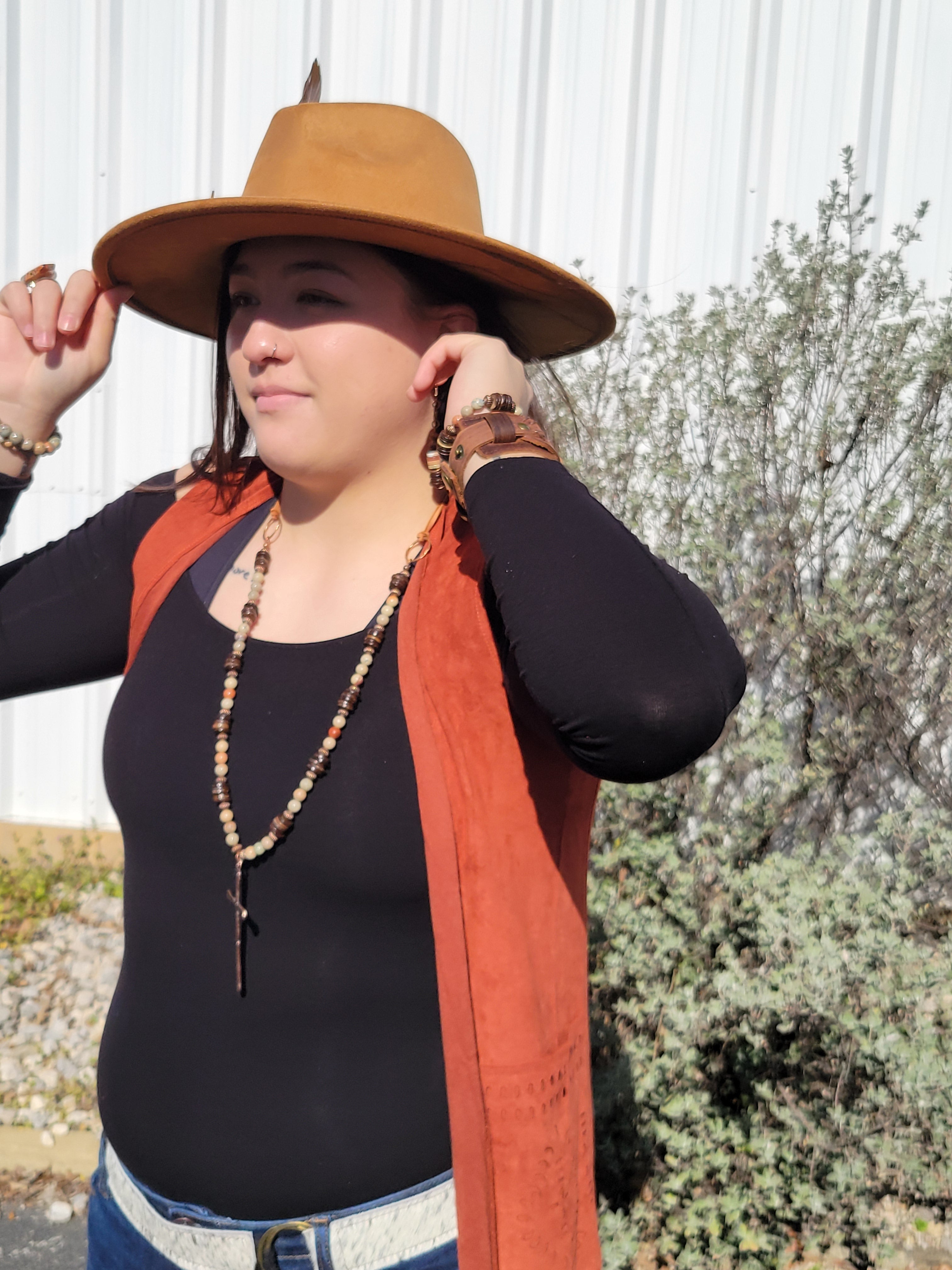 This boho western-style Aqua Terra wood necklace features a beautiful, rustic copper cross pendant. Add a unique touch to any outfit with this one-of-a-kind handcrafted piece. Both trendy and timeless, it's perfect for those with a free-spirited style.