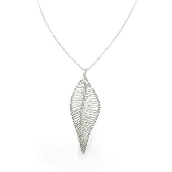 Ready for your summer sundresses, and then carrying you into fall, the Botanical necklace is a stunning silver wire leaf woven together by our artisans and then given a fun twist to catch the sunshine. The 3 inch pendant hangs on a 36 inch chain.