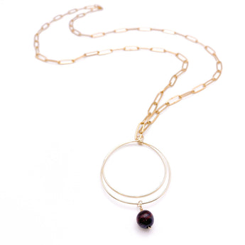 Gold plated paperclip chain holds a double circle wire pendant with a genuine tiger's eye attached to the bottom loop. A lobster clasp gives you options in your length.