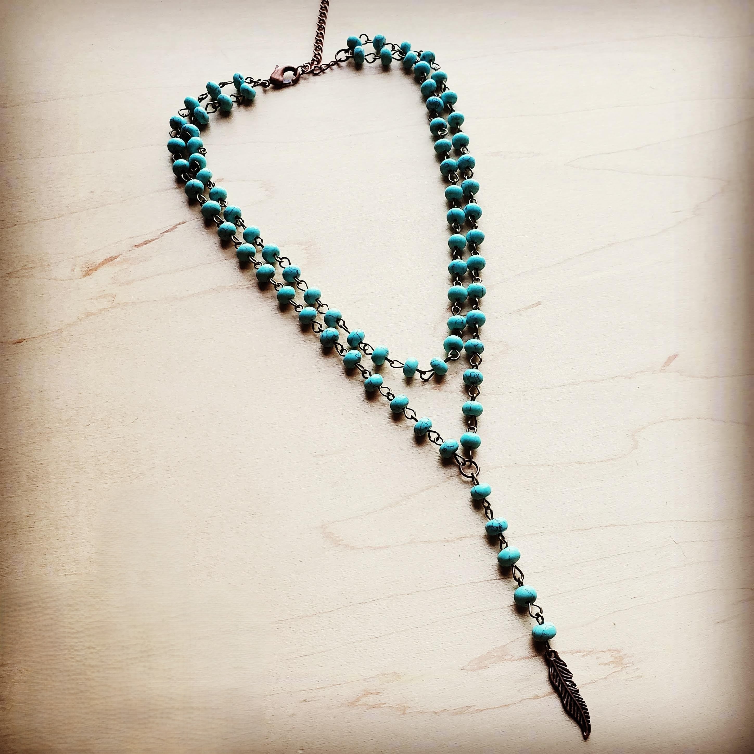 Double Strand Lariat Blue Turquoise Necklace w/ Copper Feather 251e