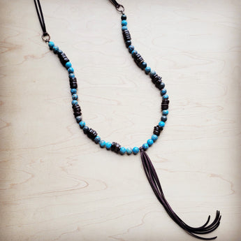Ocean Agate Necklace with Wood Beads and Leather Tassel 260b