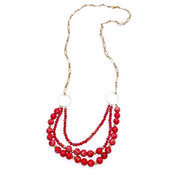 Brilliant warm red Jasper stones are the center point of this Stunning adjustable length bib necklace. Featuring a gold plated paperclip and loop chain with double lobster clasps, you can fasten the clasps along the chain or to each other to give you lengths from a neckline filling 17 1/2 inches all the way out to an elongating 28 1/2 inches. The first strand of the bib is warm red faceted crystals with hints of iridescence. The second is a combination of the crystals, gold beads and red Jasper beads, and the final is a luscious strand of gold spacer beads and round red Jasper beads