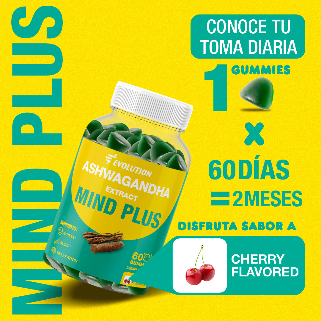 Equilibra tu día y calma tu mente con Evolution Ashwagandha Mind Plus. Nuestras deliciosas gomitas con sabor a cereza están formuladas no solo para ayudarte a manejar el estrés, sino también para promover un mejor descanso y una salud cerebral óptima. Es tu dosis diaria de serenidad y enfoque.