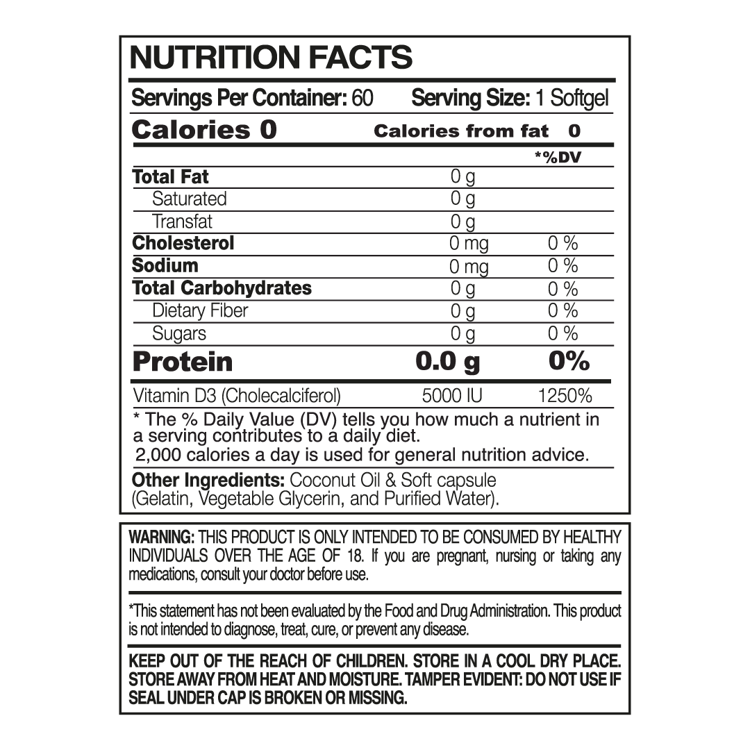 Vitamina D3 contiene 5000 UI de colecalciferol (Vitamina D3) y aceite de coco en cápsulas blandas.