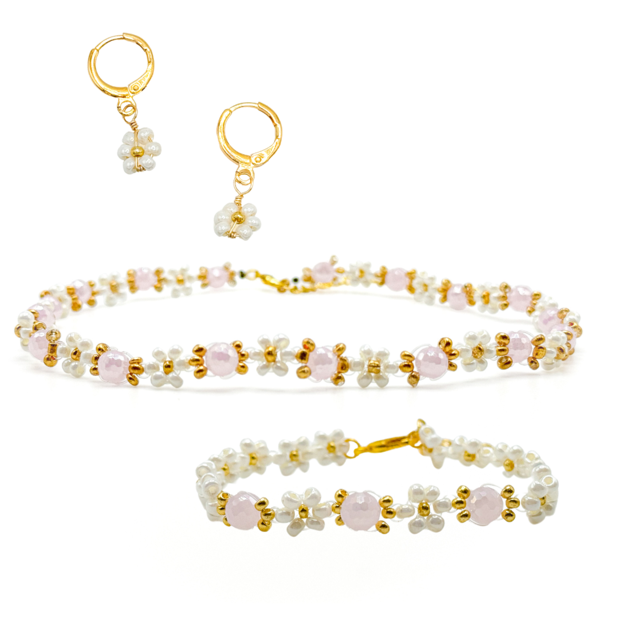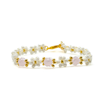 Renaissance inspiration is forefront for fall this season and the Penelope bracelet style is perfectly on trend. Pearlescent seed beads and gold plated beads are intricately formed and strung together, and in the center of the bracelet, three pale pink faceted crystals are surrounded by gold plated spacers and placed between the white flowers to create your new favorite bracelet. 6 1/2 inches with a lobster clasp and 1 1/2 inch extender.