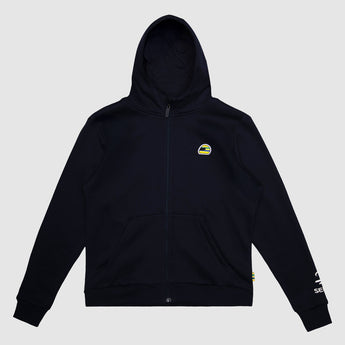 Experience the legendary spirit of Ayrton Senna in this premium zip hoodie. Crafted from heavyweight 300gsm fleece, it features an embroidered badge on the chest, a soft plastisol print logo on the back, and a raised rubber logo on the sleeve for authentic detail. The ribbed hem and cuffs ensure a perfect fit, while the full zip design and kangaroo pocket deliver everyday versatility. Bold, comfortable, and unmistakably iconic.