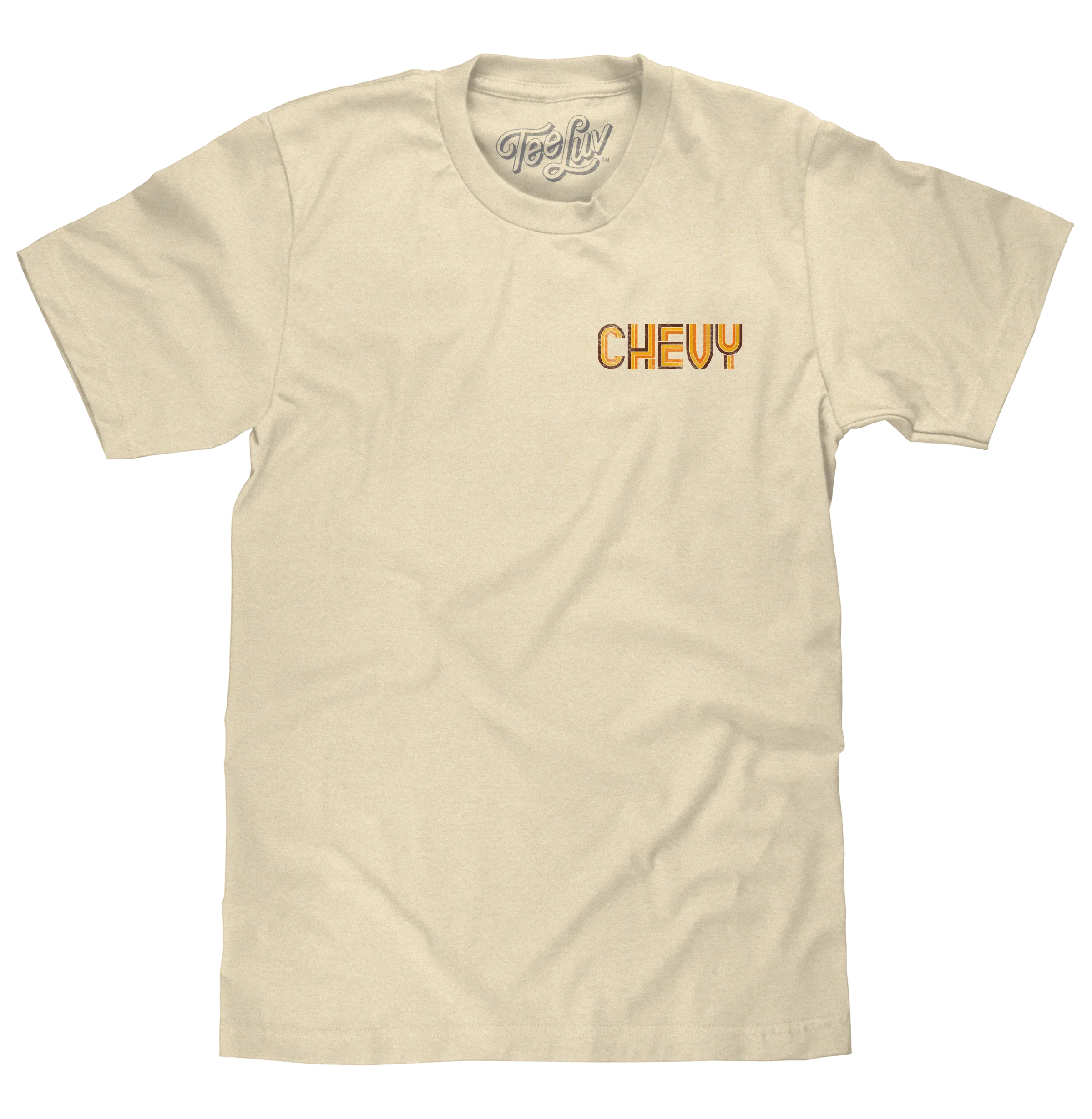 Powered by the driver's choice of a modest inline-6 up to a heart pounding 454 cubic-inch V8 on the Super Sport model - the sleek 1971 Chevrolet Chevelle isn't just a car. This mean machine defines "muscle", combining the raw power and classic American style that made the 70s anything but ordinary for carmakers! To celebrate this groovy ride, we decided to kick it old school with a double sided car brand t-shirt featuring the Chevy logo on the front left chest, and for the back - we've selected the Chevy Chevelle text along with a head-on graphic of the 1971 model. To ensure that this retro 70s Chevy shirt stands out - we've distressed and printed the design on a soft, cream cotton tee.