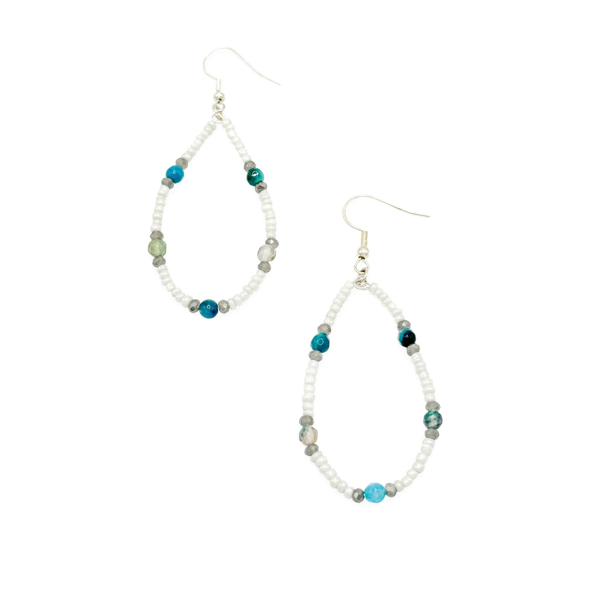 You'll hear the beach calling with your Beach Comber earrings. A silver wire beaded with white seed beads, silver crystals and shades of sea blue and grey agate stones in a nautical pattern forms a teardrop and hangs from a hypoallergenic silver plated fishhook.