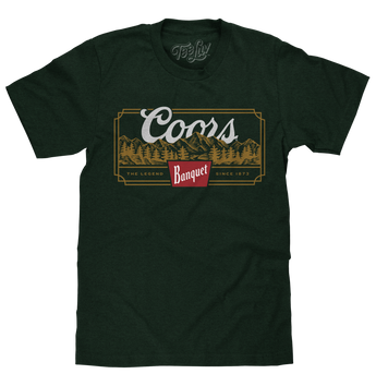 There's a saying that one should "see the forest for the trees", but the Tee Luv Arts Department really loves getting all the details perfect! Inspired by the legendary Coors Banquet brew and its home at the base of Colorado's Rocky Mountains - we've crafted this comfortable country themed shirt featuring the "Coors Banquet" logo and "The Legend Since 1873" text against a rugged mountain forest background. To complete the nature-inspired look and feel of this Coors Banquet shirt - we've printed the design on a soft, 100% cotton Forest Green tee.