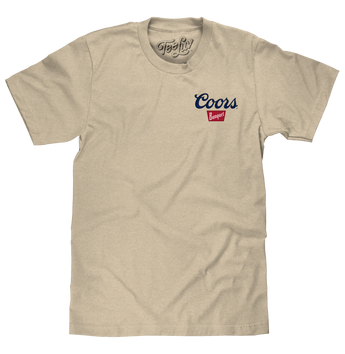 Our team paid tribute to Coors and their dedication to tradition and craftsmanship with a truly timeless beer brand t-shirt featuring the Coors Banquet logo. To give this vintage Coors Banquet shirt added depth - we've embroidered the design on the left chest of a soft, sand cotton tee shirt.