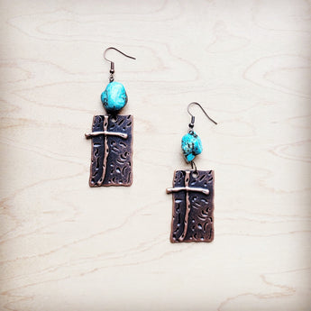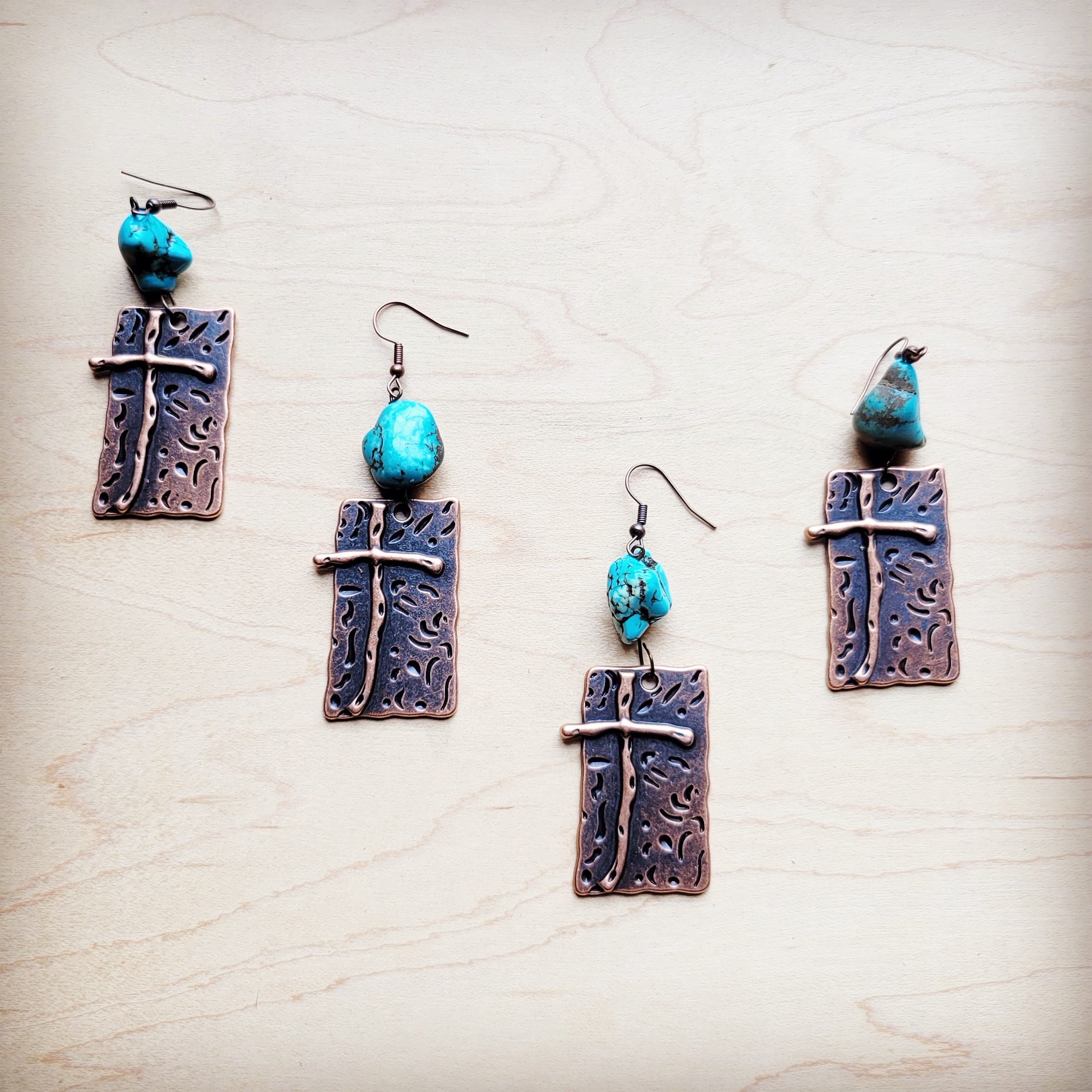 Copper Cross Earrings w/ Blue Turquoise Chunks 225e