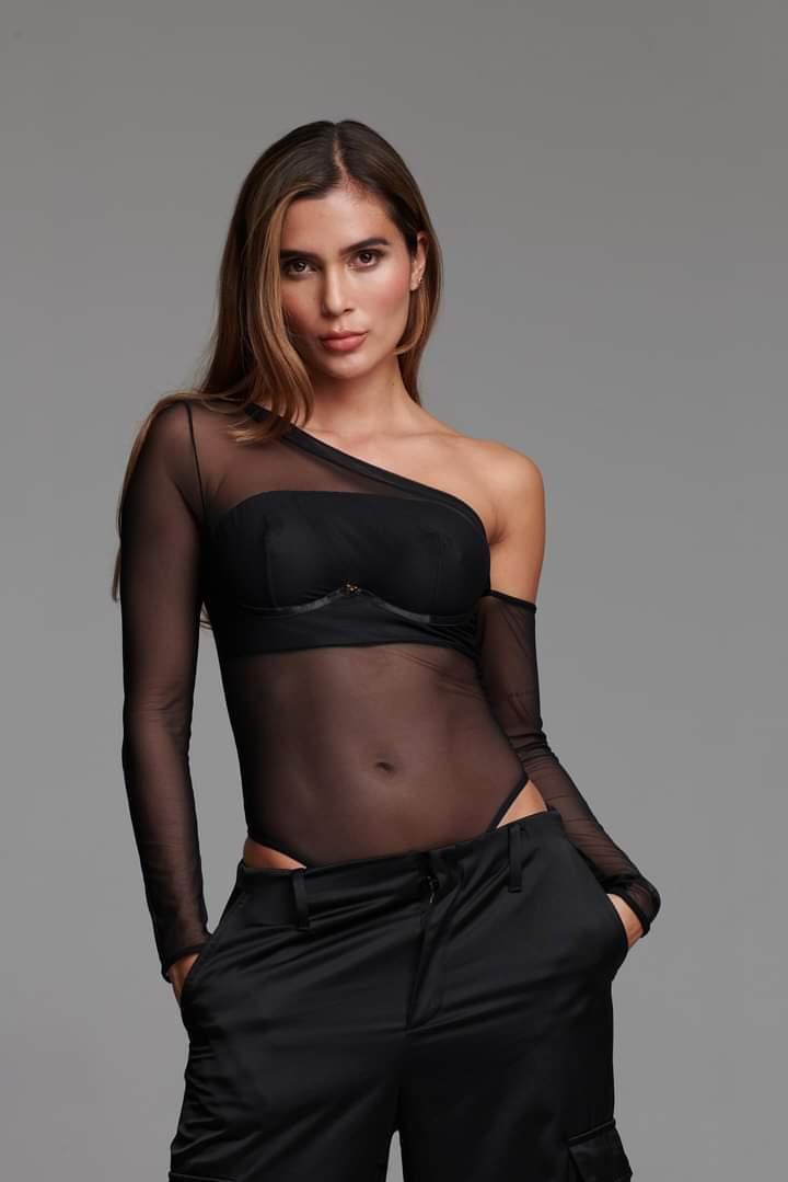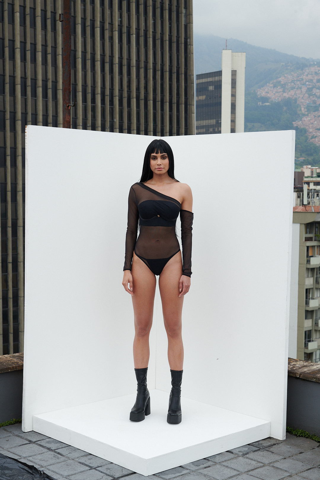 Este Body asimétrico con transparencia, es la definición de sofisticación y sensualidad al mismo tiempo. La manga larga en contraste con el hombro descubierto añade un estilo único.