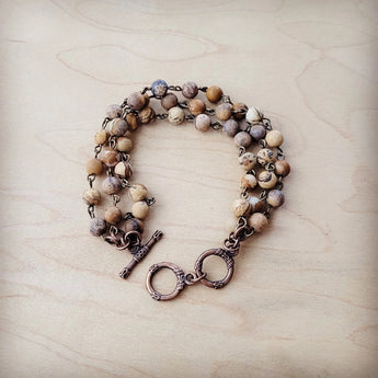 Introducing the Frosted Picture Jasper Triple Strand Bracelet 808f. This piece of jewelry features a sleek boho style, with a layered western look. Crafted with three strands of frosted picture jasper, this piece is a timeless addition to any jewelry wardrobe.