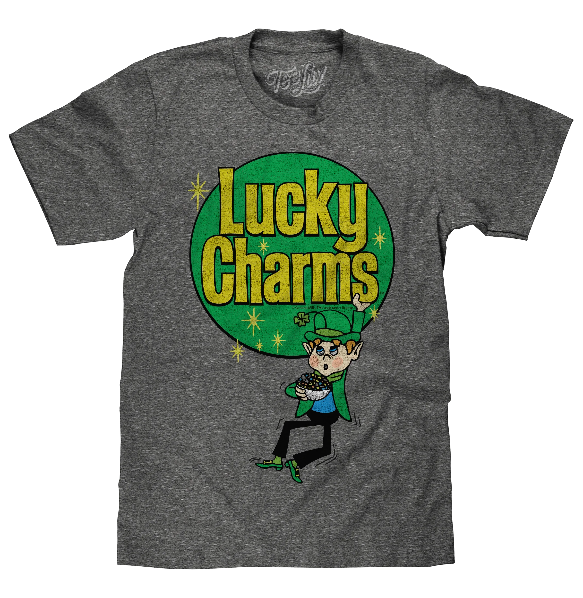 Breakfast wouldn't have been the same without a bowl of this magically delicious marshmallow cereal, so we've paid tribute to Lucky Charms by featuring an 80s graphic of Lucky the Leprechaun and the authentic licensed Lucky Charms logo on this tee.