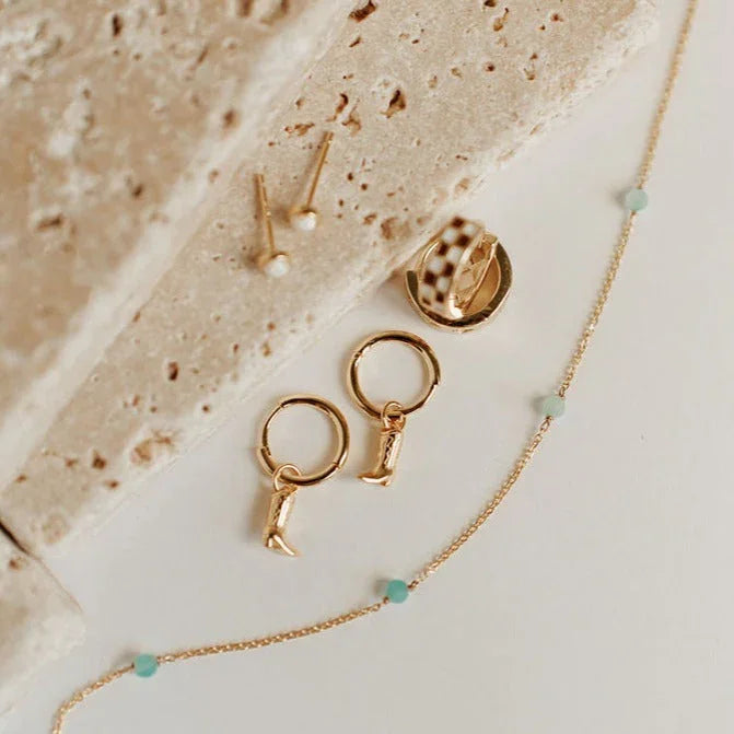 The Malibu Necklace in Turquoise is a dainty pearl necklace made of high quality, hypoallergenic gold vermeil (gold fill over sterling silver). Chain measures 14.5" with an extender up to 16.5". Perfect accessory to add a touch of color, and still matches with everything!