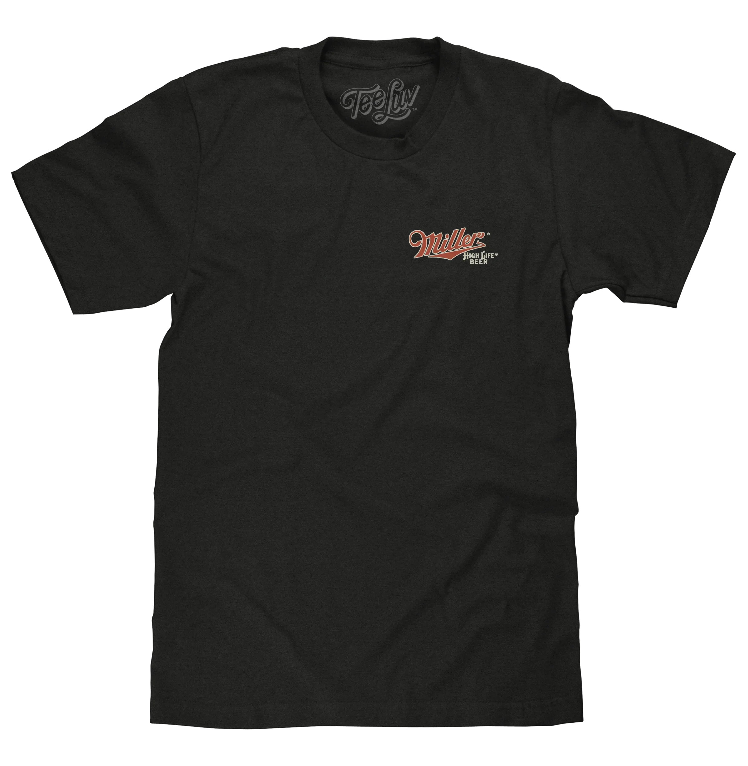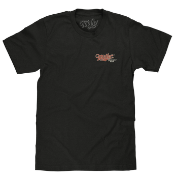 We don't know much about the mysterious maiden that has graced glass bottles and cans of High Life for over 100 years, but we do know that she has excellent taste! To help fellow fans celebrate the "Champagne of Beers", the Tee Luv team created this dreamy double-sided graphic tee featuring the Miller High Life logo printed on the left chest, along with a full-sized graphic of the elegant "Girl In The Moon" raising a toast on the back. To give this Miller High Life shirt a comfortably casual look and feel - we've printed the design on a soft, Vintage Black cotton tee.