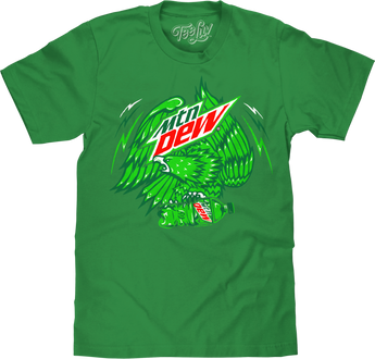 The powerful taste of Mountain Dew deserved an equally powerful graphic tee! To help pay tribute to this delicious and refreshing citrus soda, the Tee Luv team crafted this tough but comfortable graphic tee featuring the "Mtn Dew" logo, and a fierce green eagle clutching a bottle of Dew with its talons.