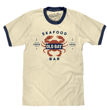 For fellow foodies that couldn't live without this delicious seasoning, our team decided to create a fun graphic tee inspired by coastal restaurants featuring the Old Bay Seasoning logo, and "Seafood Bar" and "Fresh Local" text.