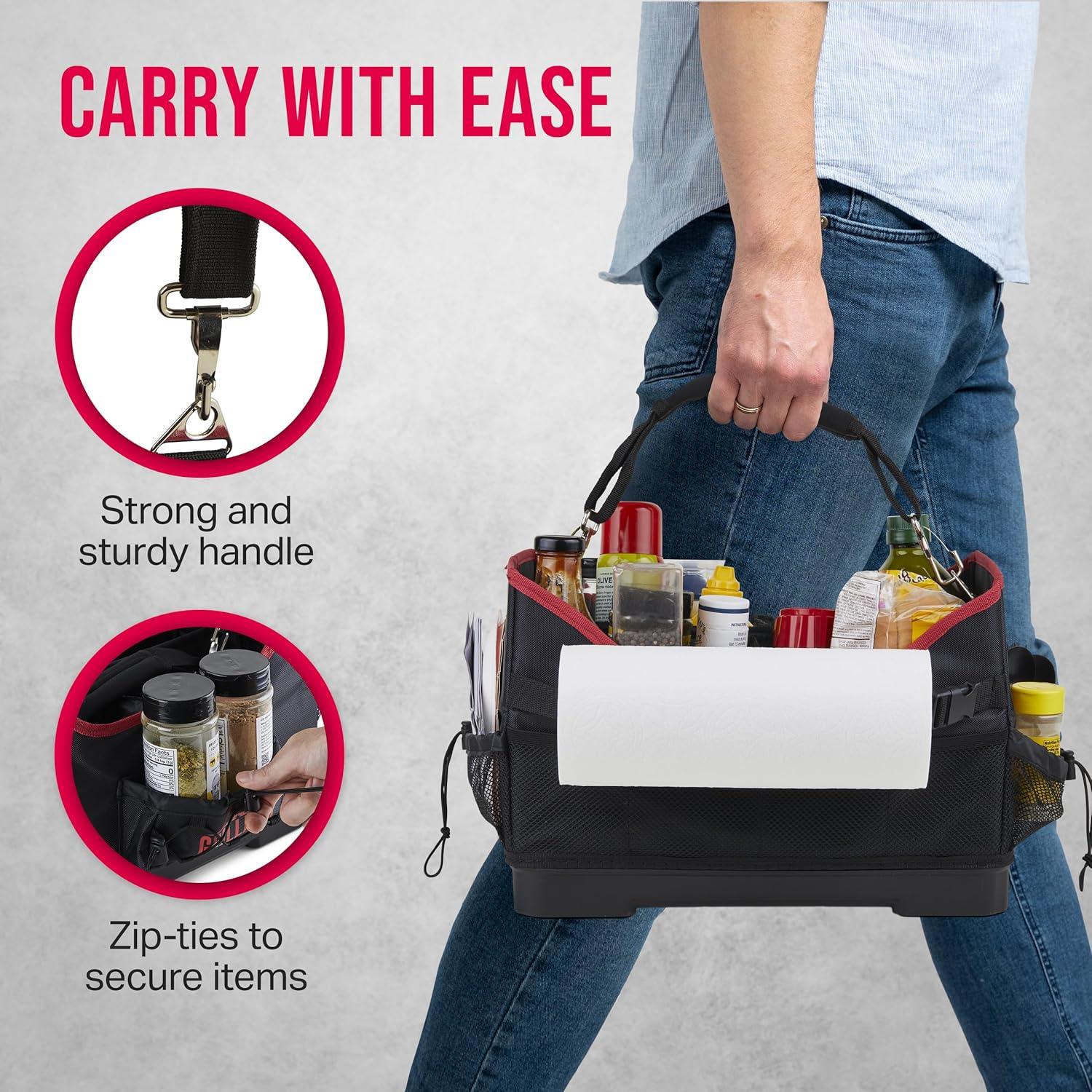Transporte Fácil y Seguro: Equipado con una correa de transporte fuerte y resistente y cremalleras exteriores para asegurar tus artículos, este caddy para parrilla es perfecto para llevar todos tus esenciales cuando vas de un lugar a otro, ya sea al patio trasero o a un campamento.