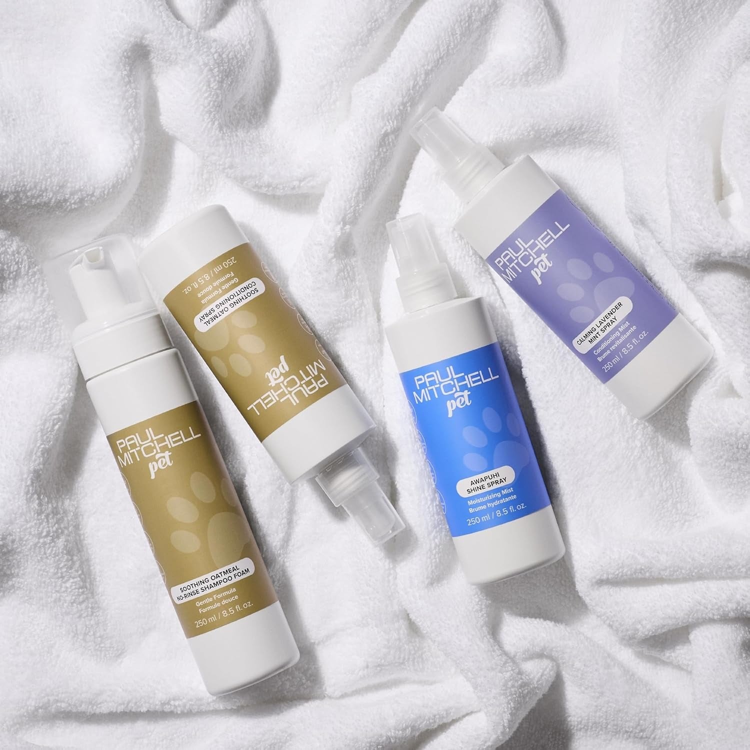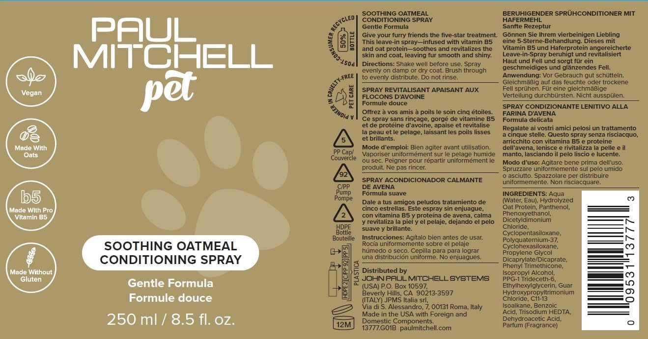 PAUL MITCHELL PET SOOTHING OATMEAL CONDITIONING SPRAY Give your furry friends the five-star treatment. This leave-in spray-infused with vitamin B5 and oat protein-soothes and revitalizes the skin and coat, leaving fur smooth and shiny.