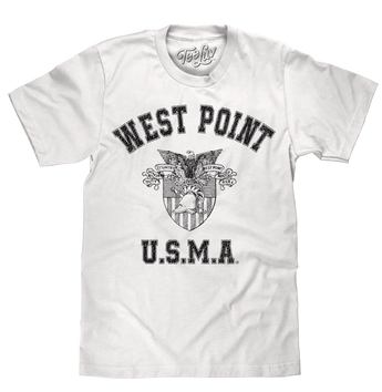 We decided to pay our respects to "The Point" and its rich history with a graphic tee featuring the instantly recognizable USMA coat of arms, and "West Point U.S.M.A." text. To complete the vintage look and feel on this West Point t-shirt - we've distressed the entire graphic, and printed it on the softest and highest quality, white cotton tee we could find.